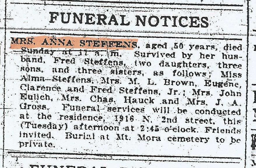 | Mother of: Alma Steffens, Mrs. M L Brown, Eugene Steffens, Clarence Steffens, Fred Steffens Jr. |